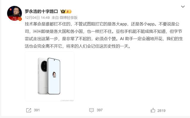 罗永浩表示,技术革命是谁都拦不住的,不管试图阻拦它的是各大app,还是各小app。