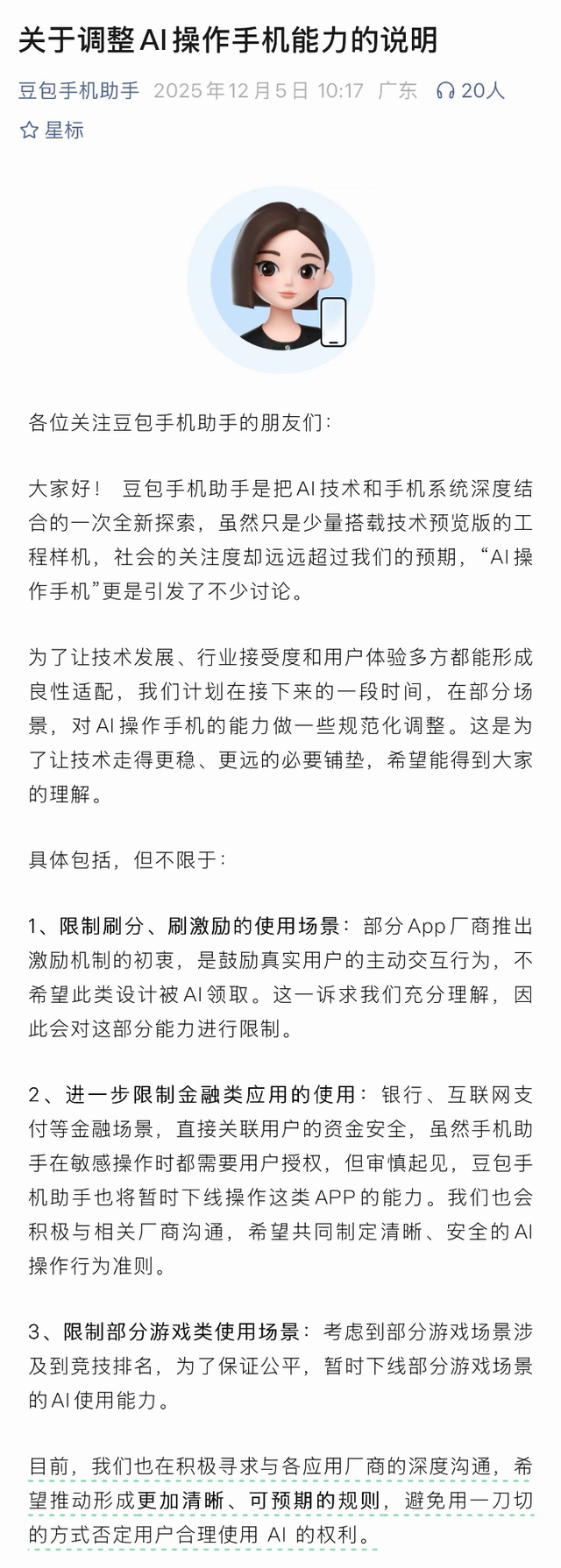 同时豆包也开始限制部分使用场景,包括限制刷分、刷激励的使用场景;限制金融类应用的使用;限制部分游戏类使用场景。